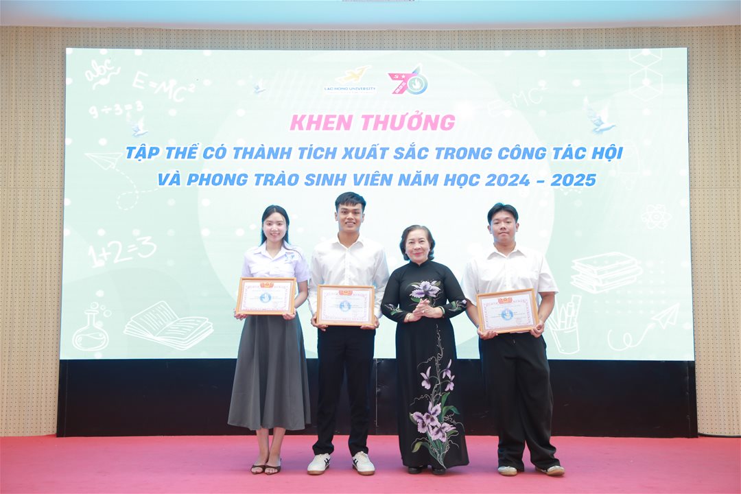 Dịp này, Hội Sinh viên Trường Đại học Lạc Hồng đã tổ chức trao Giấy khen cho 03 tập thể có thành tích xuất sắc trong công tác Hội và phong trào sinh viên, gồm: Khoa Ngôn ngữ Anh, Khoa Tài chính – Kế toán và Đội Revamp CREW.