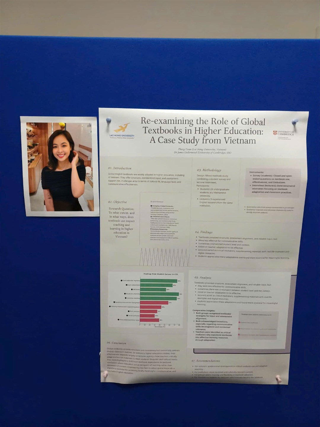 Nghiên cứu được trình bày có tiêu đề: “Re-examining the Role of Global Textbooks in Higher Education: A Case Study from Vietnam”. Bài báo này khảo sát việc sử dụng giáo trình tiếng Anh toàn cầu trong bối cảnh Đại học Việt Nam, nêu bật nhu cầu cấp thiết phải điều chỉnh để phù hợp văn hoá và trình độ người học.