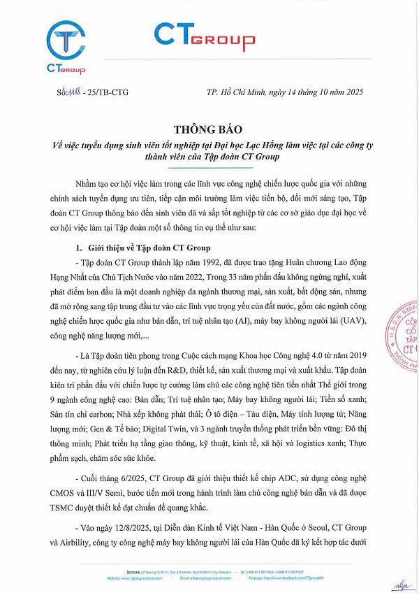 Thông báo tuyển dụng lần thứ 36, năm học 2025 - 2026. Tập đoàn CT Group