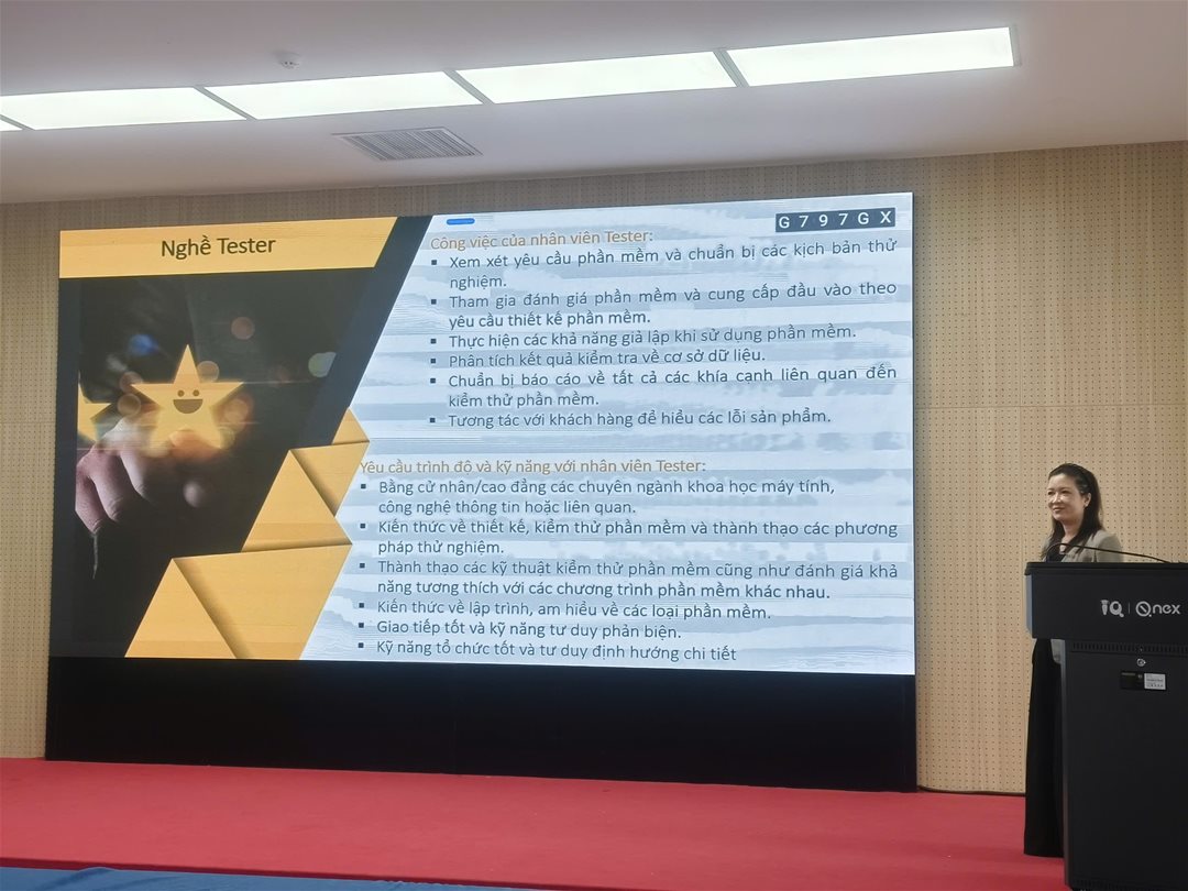 Bên cạnh đó, cô còn giới thiệu các xu hướng ứng dụng Trí tuệ nhân tạo (AI) trong kiểm thử, tự động hóa quy trình, và tối ưu hóa trải nghiệm người dùng – những kỹ năng đang được các doanh nghiệp công nghệ hàng đầu quan tâm.