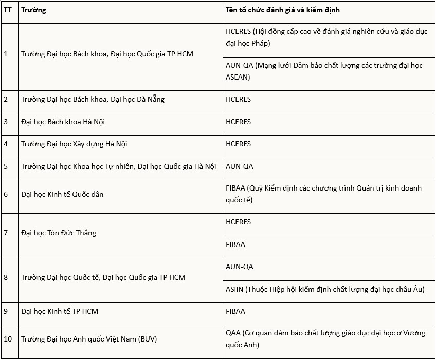 Currently, MOET authorizes 19 education quality accreditation organizations, including 11 international and 8 domestic. Each has its own evaluation criteria, weightings, and costs.
